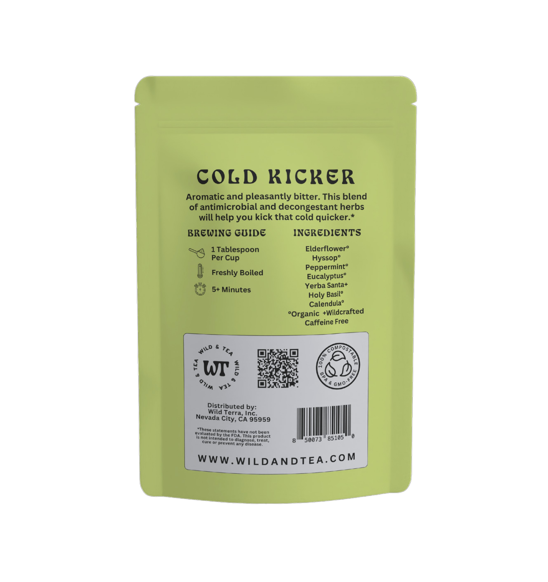 Cold Kicker Herbal Tea: Organic elderflower, organic hyssop, organic peppermint, organic eucalyptus, wildcrafted yerba santa, organic holy basil and organic calendula. Caffeine free