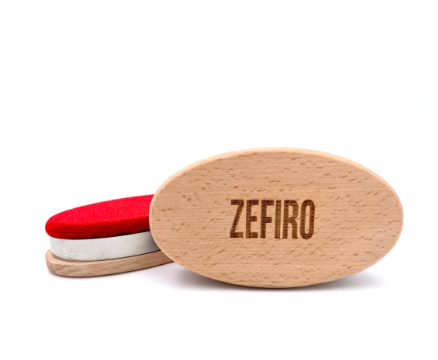 This fuzz remover is made from beechwood, stainless steel and a polyester velvet.
