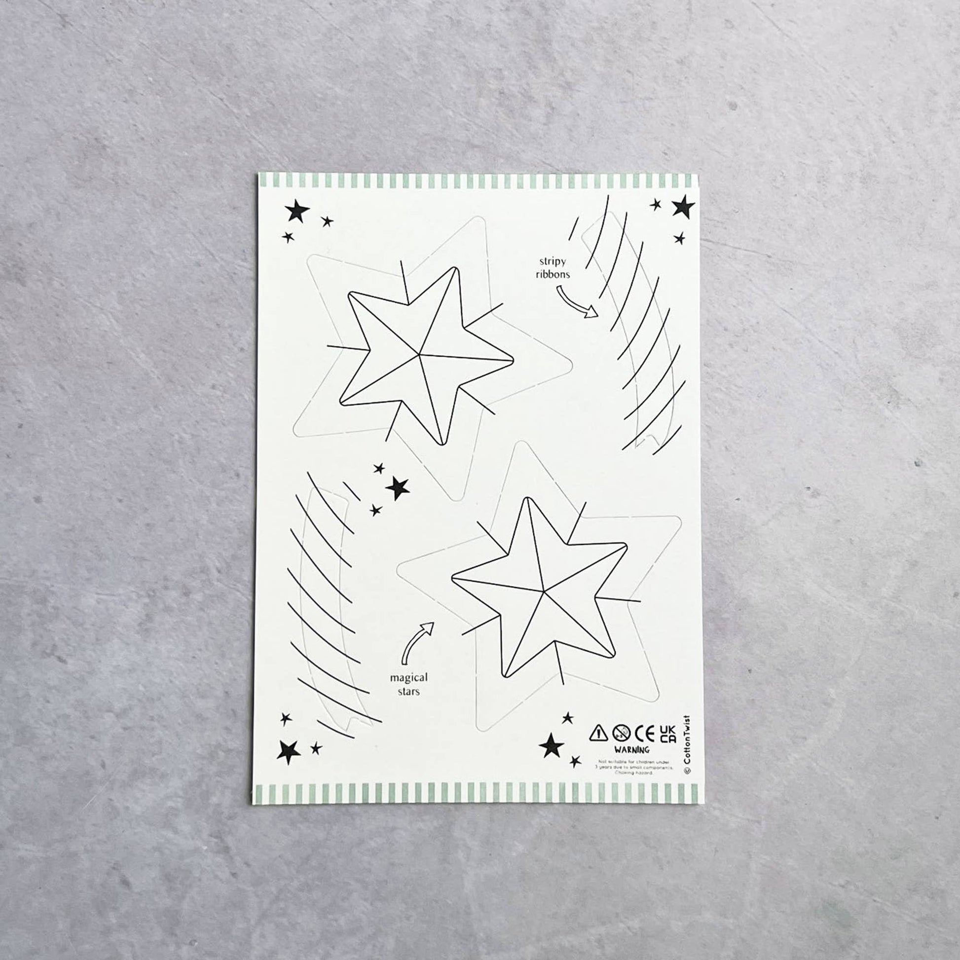Children can color the star & ribbon cut outs with their chosen pattern, then it's time to construct their wand. Once the stick & ribbons are taped on, the stars can be stuck together. Beads can be added to the base of the ribbons for additional effect.