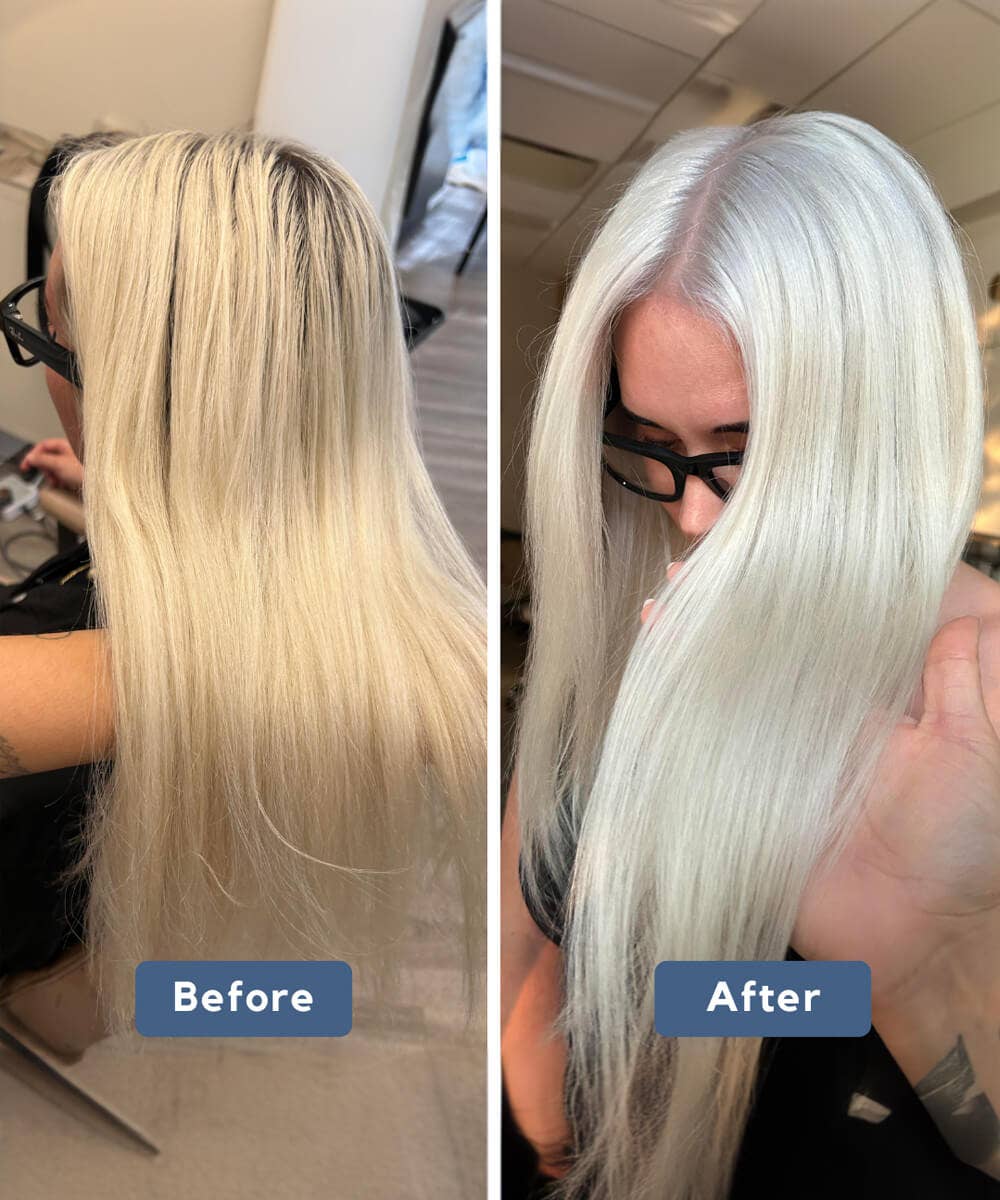 Thoroughly wet hair and massage in shampoo. Work through hair from roots to ends to ensure full coverage and even toning. Leave in for 1 – 3 minutes depending on the desired amount of neutralizing, then rinse clean with cool water.