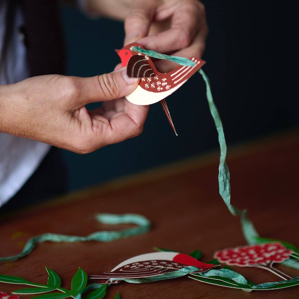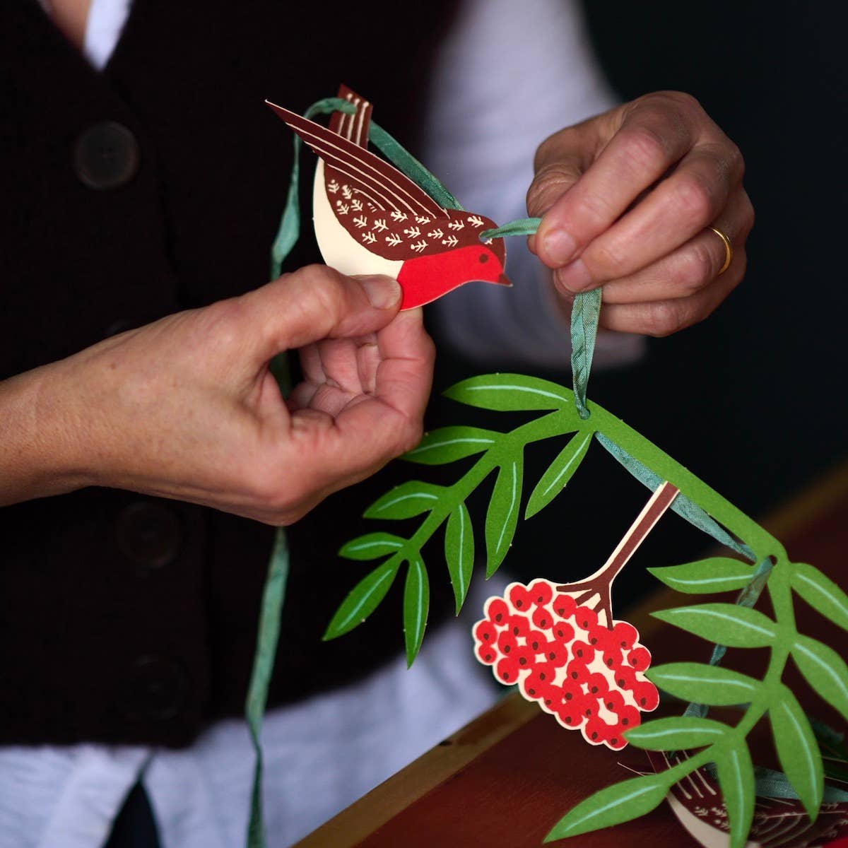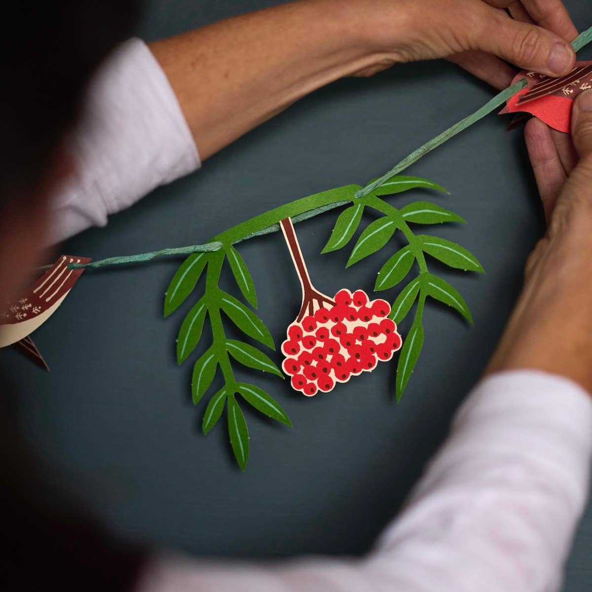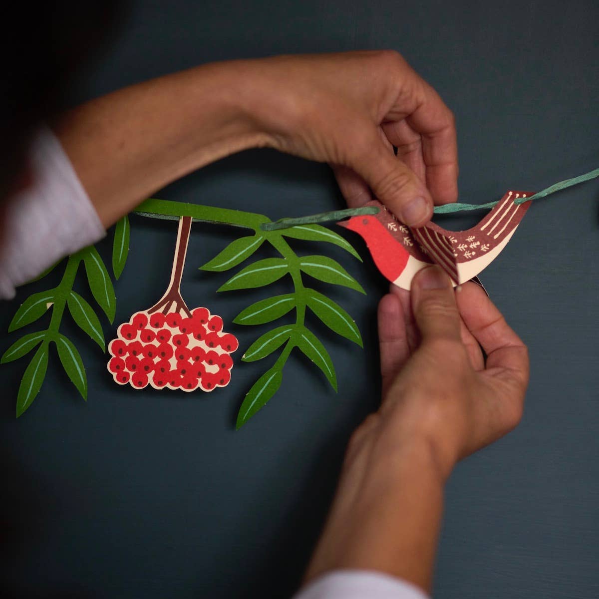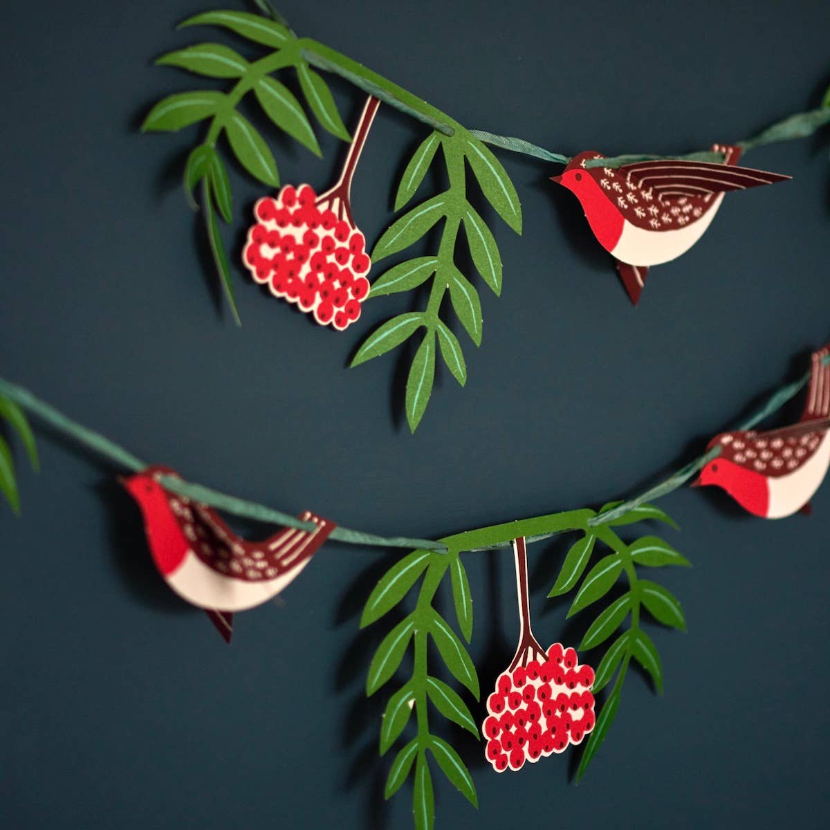 Six sprigs of rowan leaves and berries, and eight very charming robins contained in a self-closing card wallet for long term storage. Pop out and string together on yarn or ribbon of your choice. The leaves and birds make approximately 2-3 metres of garland, depending on how closely they are strung together. Thread is not included.