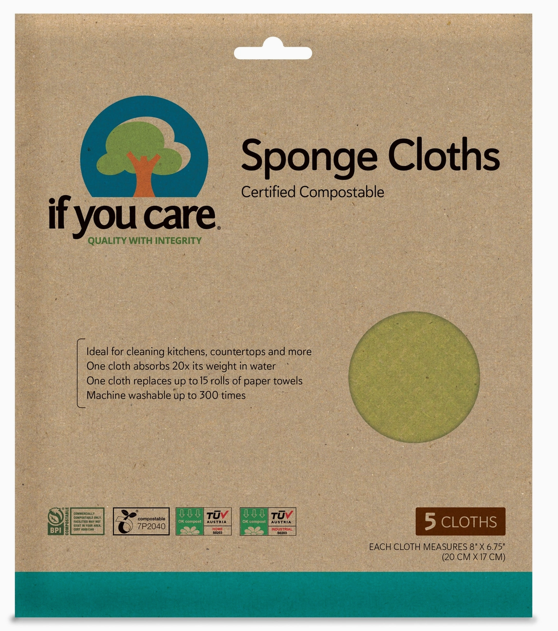 It can absorb up to 20 times its own weight in water. There is no better or more effective cleaning cloth for kitchens, countertops, bathrooms and general household cleaning, available anywhere. If You Care Sponge Cloths leave no streaks. They absorb liquids easily and quickly and release them with simple wringing. They are remarkably durable, tear and abrasion resistant, reusable over and over again, and can be machine washed in water up to 190F (88C), up to 300 times.