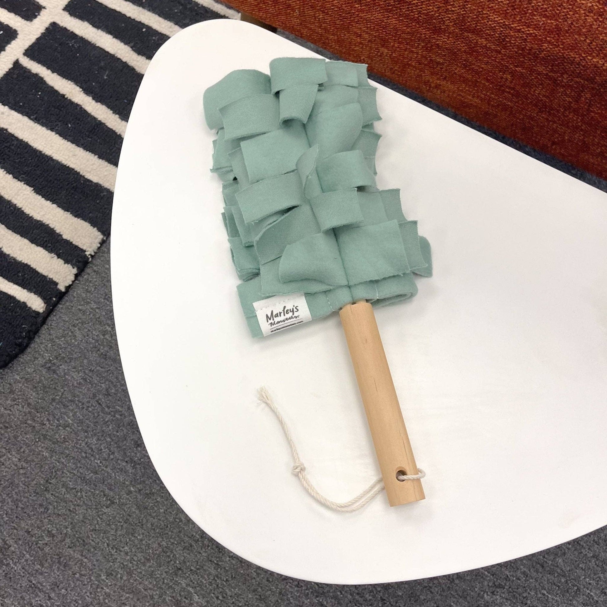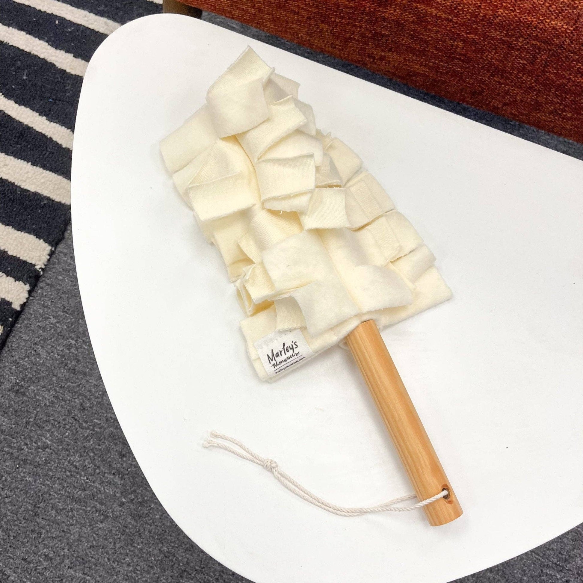 Washable Duster Heads are made from multiple layers of dust seeking organic cotton fleece and attach to a wooden handle.