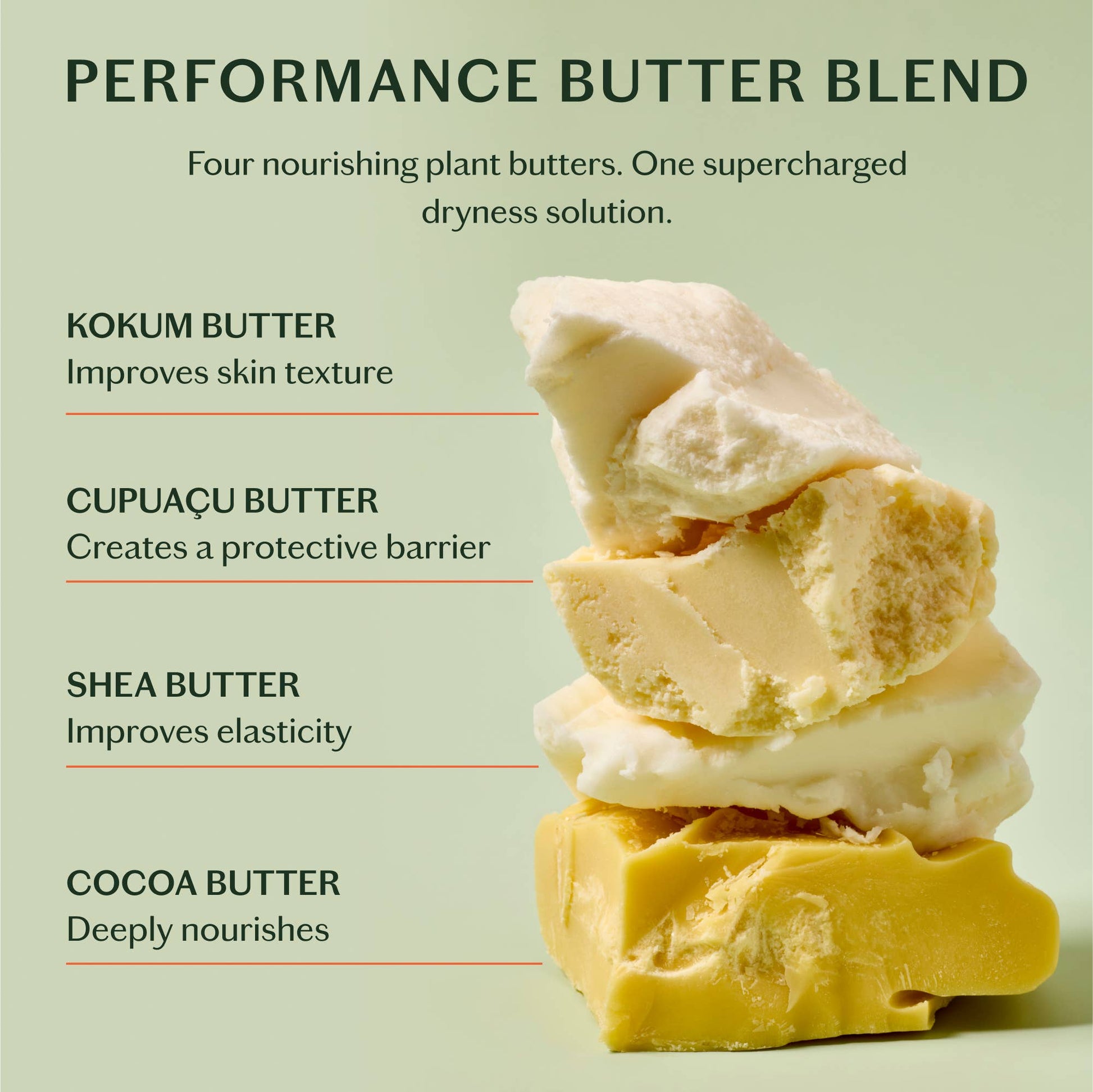 Performance Butter Blend: This powerhouse blend of pure plant butters—cocoa, shea, cupuaçu, and kokum—provides unmatched nourishment and protection. It'll replace every other balm in your bag. Lightweight & Wax-Free: We skip wax, petroleum, and mineral oil, which means our lightweight breathable formula melts effortlessly into skin without feeling greasy or clogging pores.